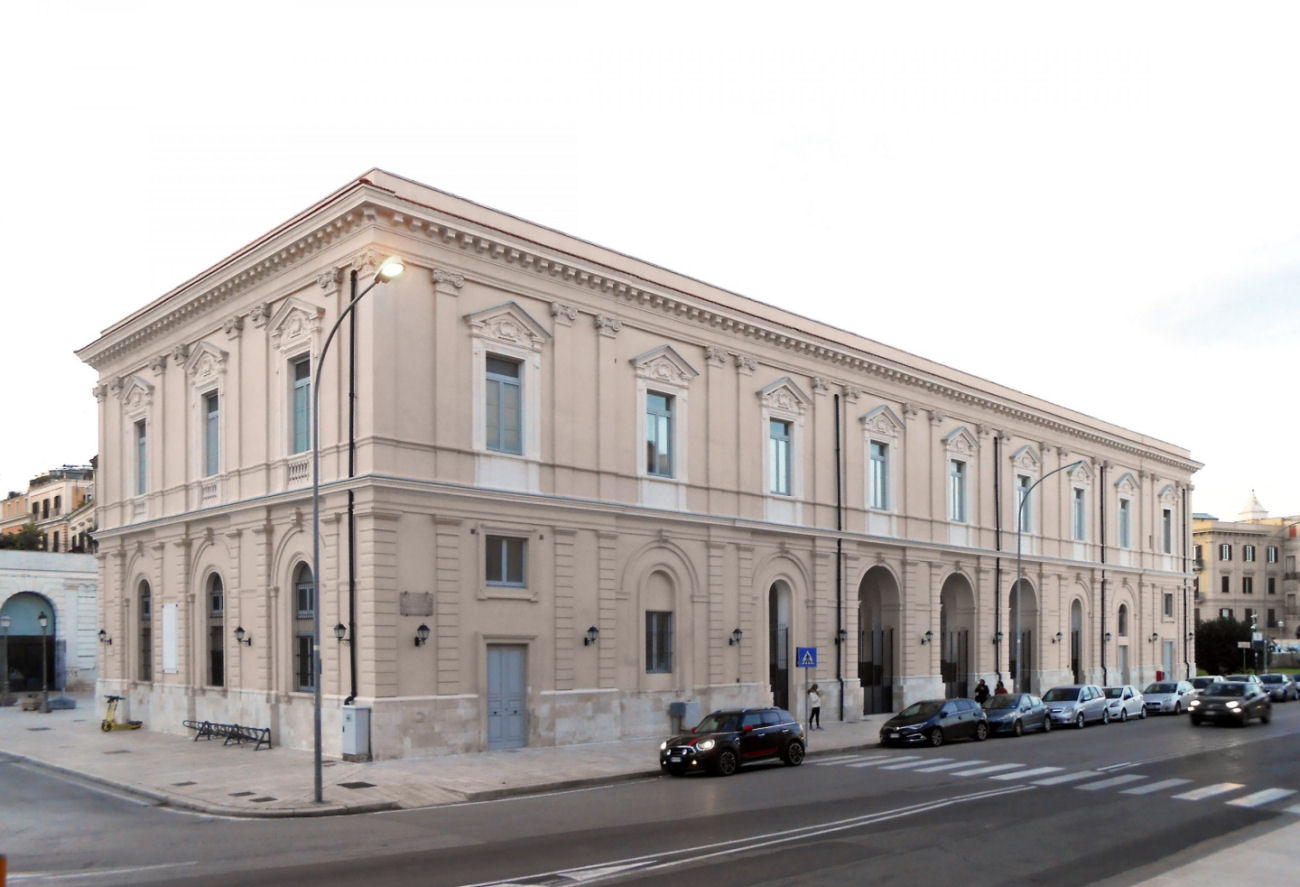The Corso Vittorio Emanuele and Via Vallisa façades have three and four bays, respectively, with ground-floor windows and access to workshops under restoration. The east frontage, maintaining the general style, has a simplified ornamentation indicating a later construction period, with architraved openings and square mezzanine windows.